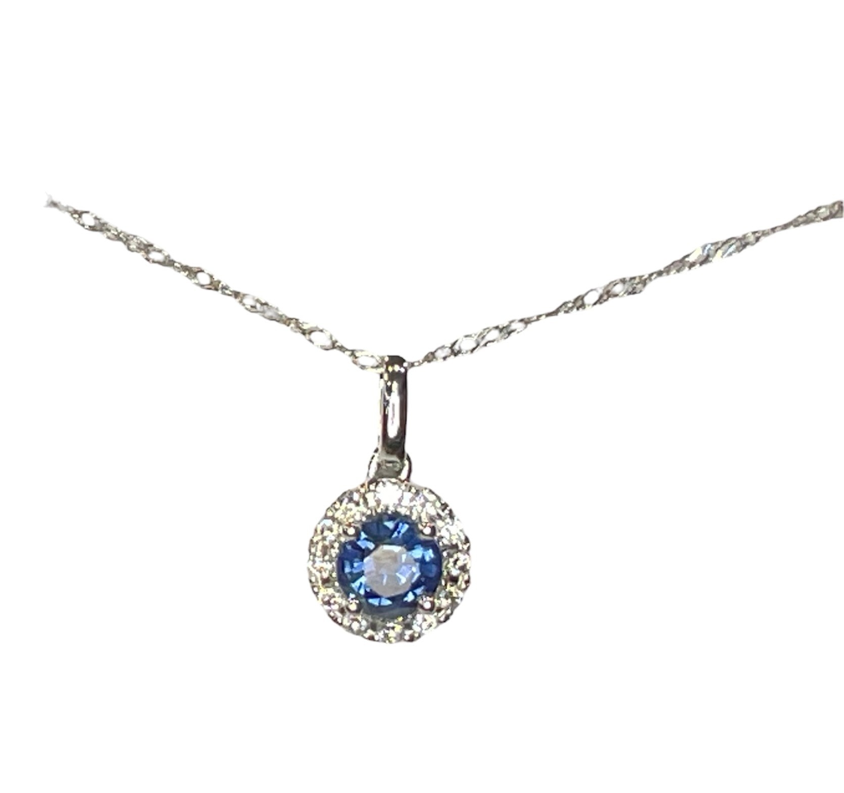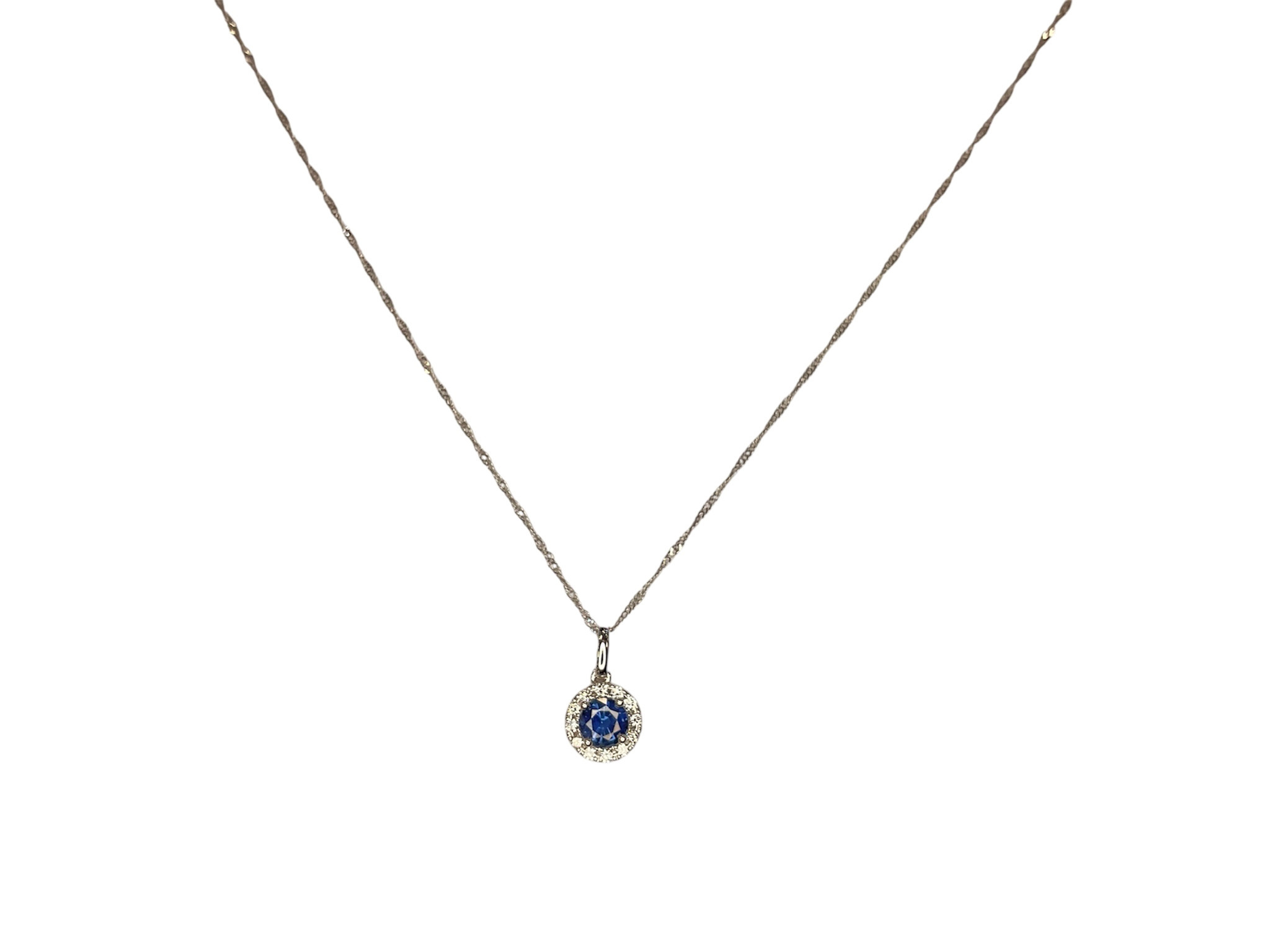 Review (Y)14KW .51CT SAPPH .10TDW DIAMOND HALO 12B & ROUND CUT BLUE SAPPHIRE PENDANT ON 18” SINGAPORE LINK CHAIN